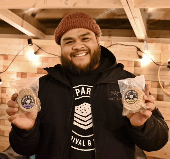 Tito Parley, owner of Tito Parley’s Sans Rival and Silvanas, holds up two flavours of his famous Silvanas (Ube Latte and Pistachio) at the Pinoy Night Market in Scarborough, Ont. Photo by Yona M. Harvey, Mabuhay Canada Media