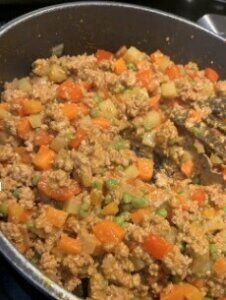 What I love about this dish is all the vibrant colours and flavours from the sweet peas, potatoes, carrots, and bell peppers, mixed with the savoury taste of ground pork.