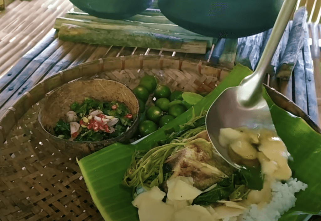 He uses bamboo leaves to line a woven basket, splashing some soup and fish on top of rice, with calamansi sliced on the side.