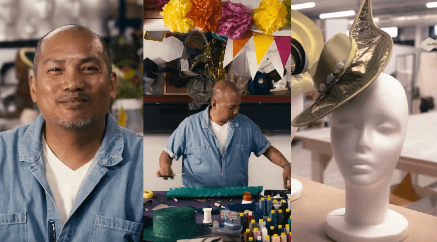 Santos also keeps his Filipino roots close to his work, using Philippine materials like sinamay and buntal and dreaming of one day sending a modernized salakot down the track at Ascot.