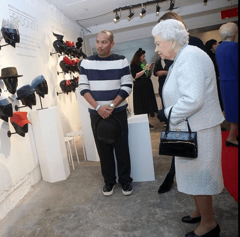 Somewhere along the way, a very special fan dropped by: Queen Elizabeth II herself stopped at his exhibition during London Fashion Week in 2018, admiring a leather crown he’d modeled on Queen Victoria’s traveling crown and trading jokes with the former ballet dancer from Cavite.